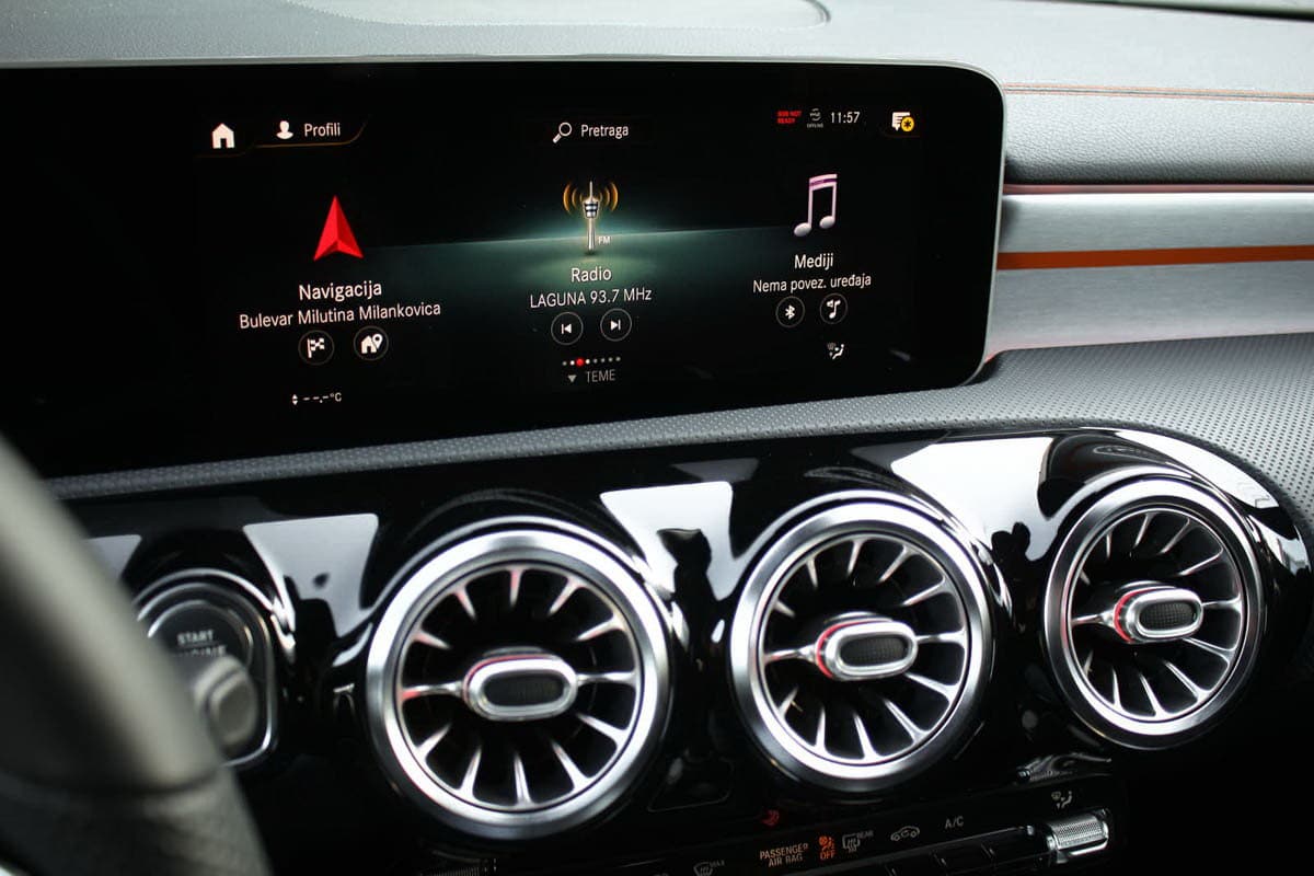 Svi najvažniji sistemi sigurnosti na broju, a tu je i čuveni „MBUX“ virtuelni asistent koji omogućava da se sa autom ispričate, izvršite brojna podešavanja kao i da dobijete sve neophodne informacije. Ukoliko auto nije povezan na internet, njihov broj je ograničen, ali i dalje glasom možete da promijenite stanicu, temperaturu klime, odaberete izvor zvuka, promijenite boju ambijentalnog osvjetljenja… Kada smo već kod nje, interesantno je da se mijenja boja tri centralna ventilaciona otvora – kada smanjujete temperaturu, oni se na trenutak poplave, a kada je povećavate – zacrvene.