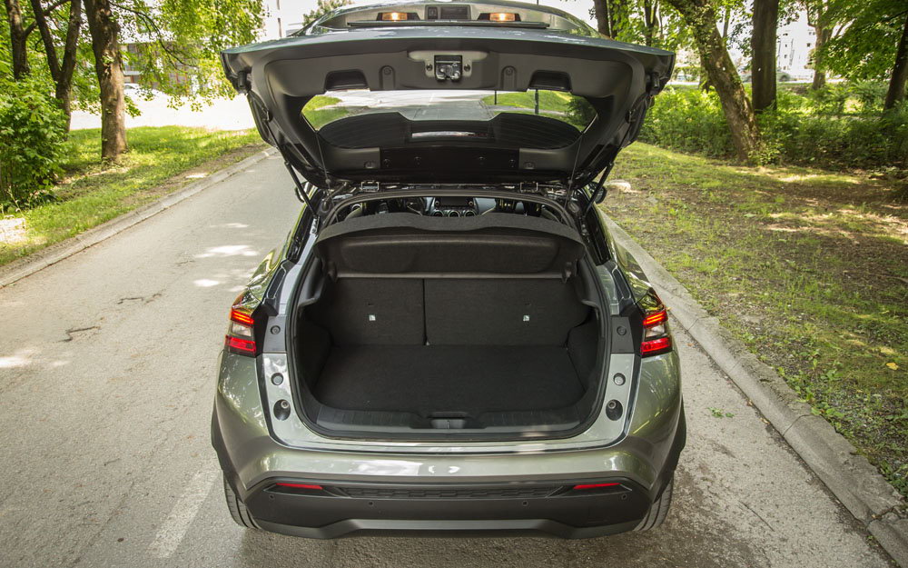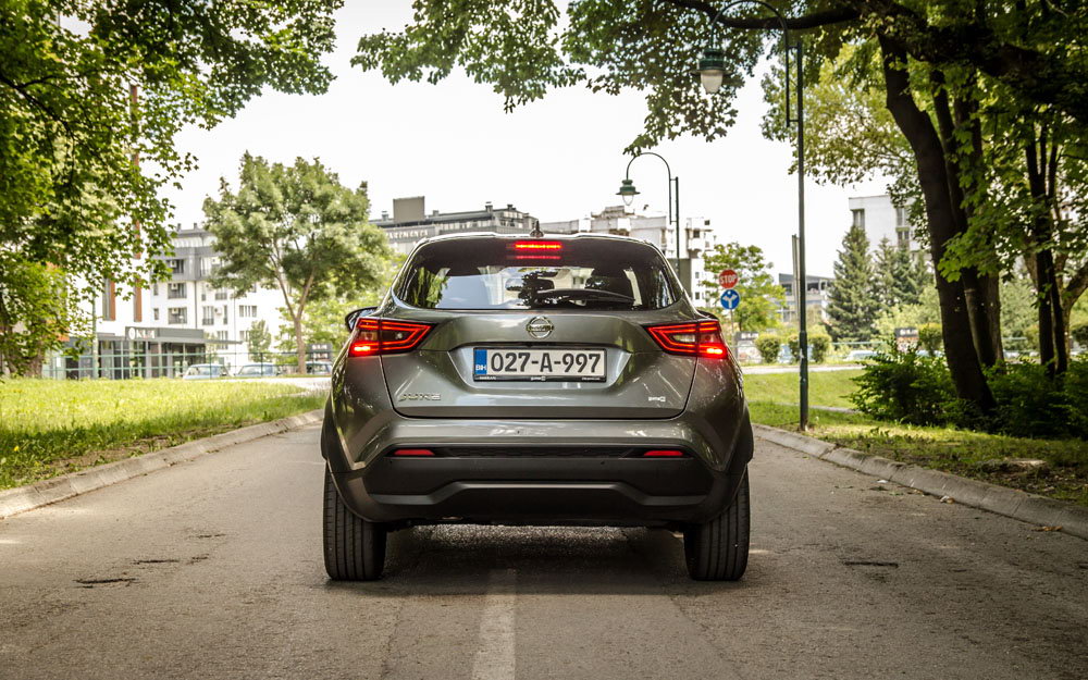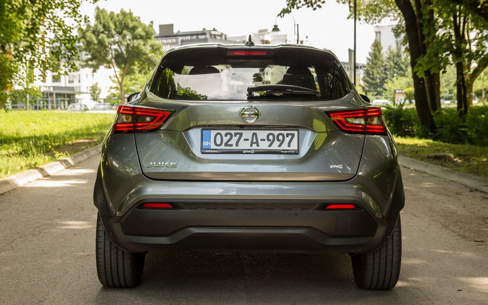 Zadnji dio automobila vrlo je jednostavan i bez suvišnih detalja. U samim krajevima nalazi se dvodijelna LED svjetlosna grupa u horizontalnom položaju. Ono što treba još spomenuti jeste i difuzor u zadnjem odbojniku koji se odlično uklapa u cjelokupni dinamični izgled automobila. Gledajući u cjelini, sa ostalim detaljima novi Nissan Juke izgleda moderno, dinamično i opet jedinstveno, što je vjerovatno i bio cilj dizajnera.