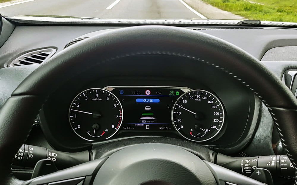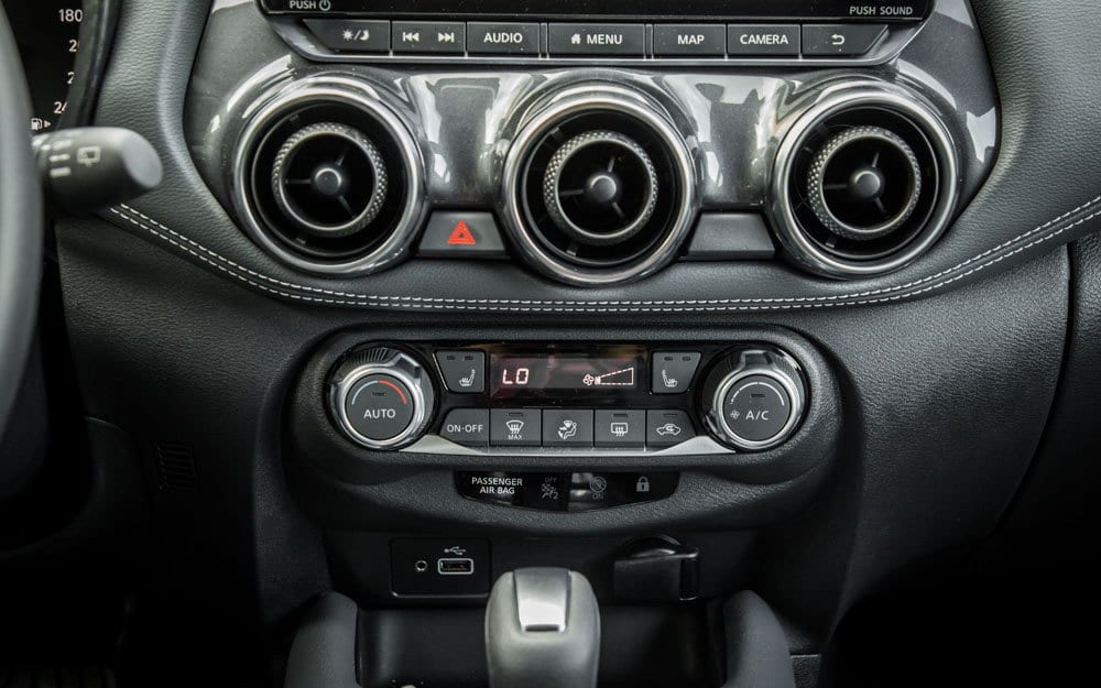 Za pohvalu je i što je Nissan zadržao prave fizičke prekidače za upravljanje ventilacionim sistemom, grijačima i ostalim bitnim dijelovima kojim se može intuitivno upravljati tokom vožnje. Iznad samih komandi nalaze se i tri okrugla ventilaciona otvora koja su se dizajnerski odlično uklopila u moderni i futuristički dizajn automobila. Iznad njih naslanja se veliki centralni ekran osjetljiv na dodir čija dužina dijagonale iznosi 8 inča. Prolasci kroz menije infotainment sistema obavlja se opet preko fizički prekidača što opet pojednostavljuje korištenje u vožnji. Palac gore za odlično kombinovanje modernih i tradicionalnih rješenja.