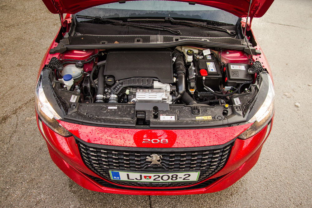 Testni model pokretao je 1.2 litreni trocilindarski PureTech turbo motor sa 100 KS pri 5.500 okr/min i 205 Nm okretnog momenta pri 1.750 okr/min. Snaga motora se prenosi na prednje točkove preko šestostepenog ručnog mjenjača čija ručica ima nešto duži hod, ali je veoma precizan. U ovoj kombinaciji motora i mjenjača novi 208 od 0 do 100 km/h ubrzava za 9,9 sekundi i postiže maksimalnu brzinu od 188 km/h.