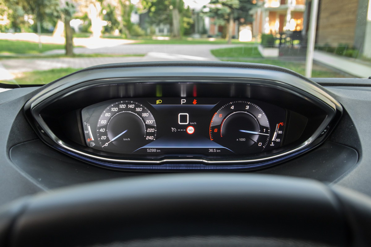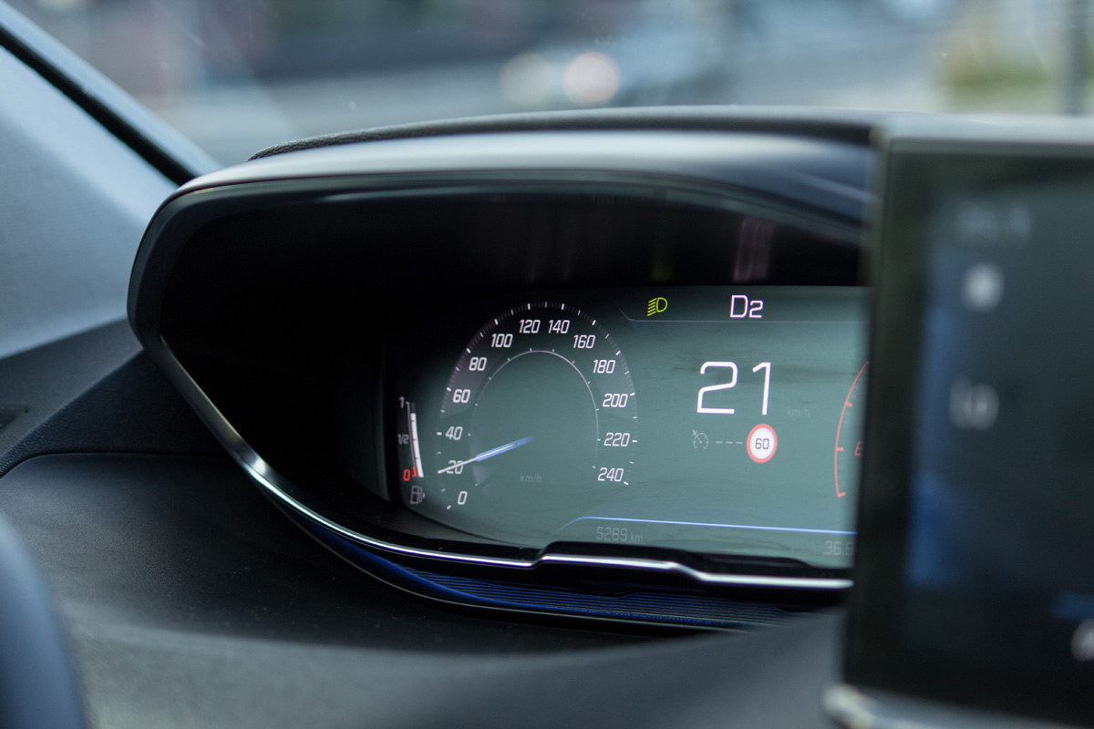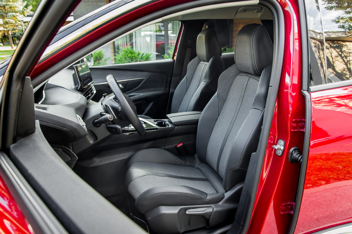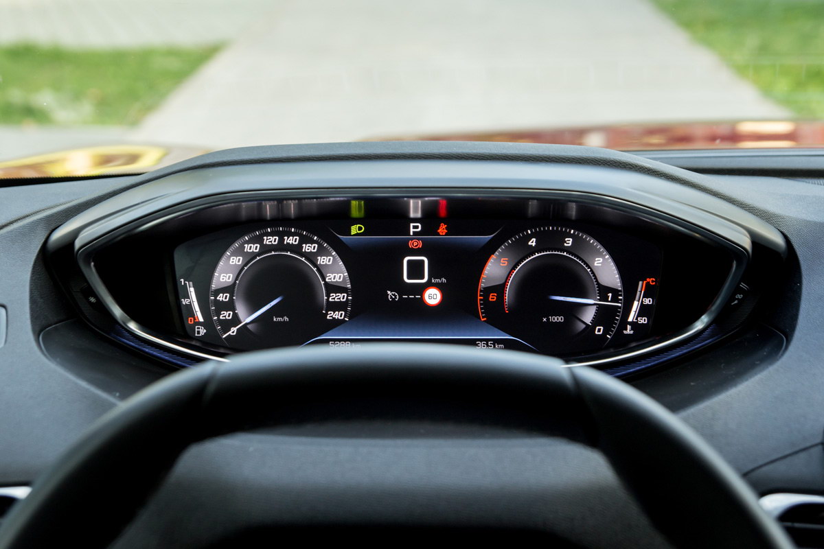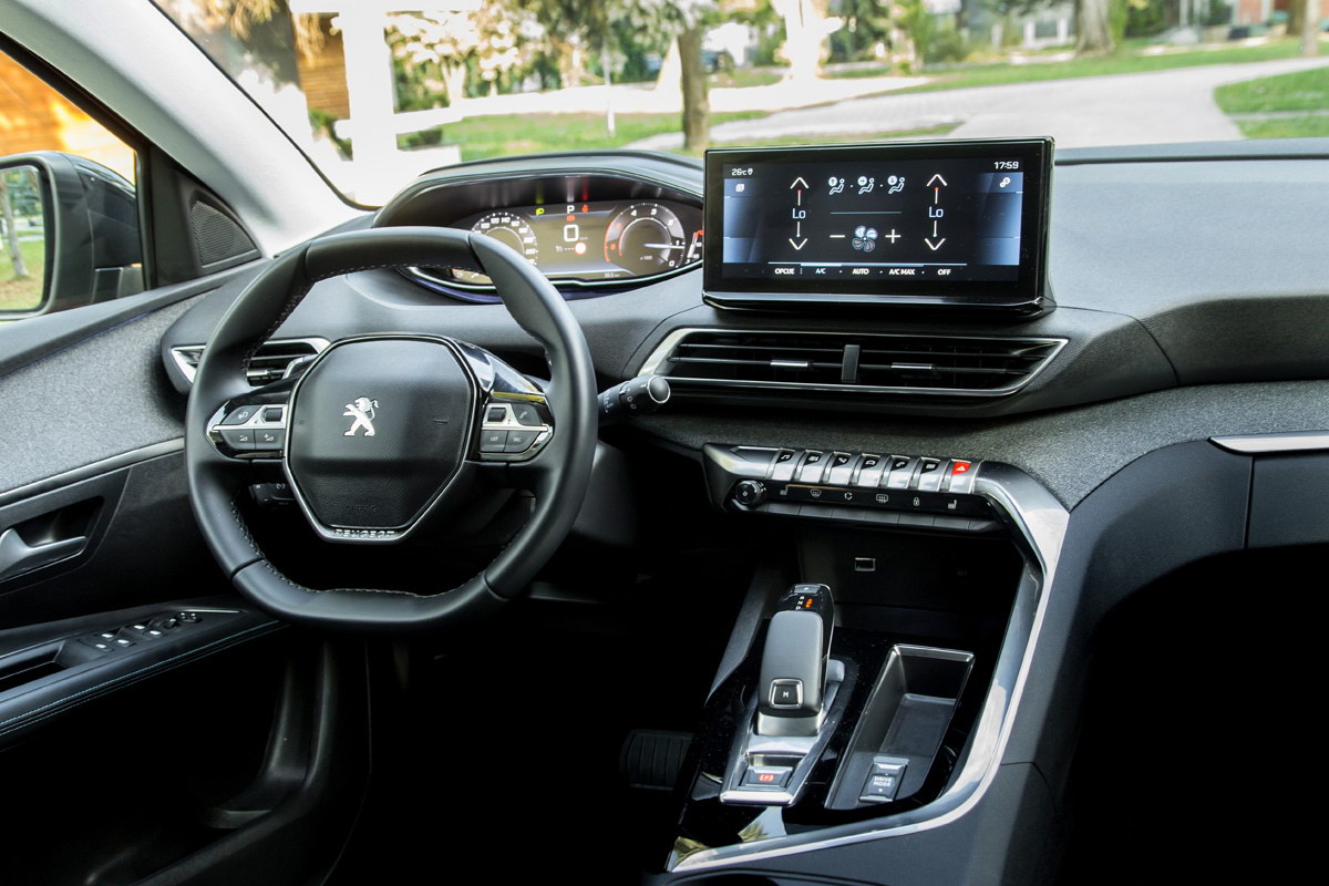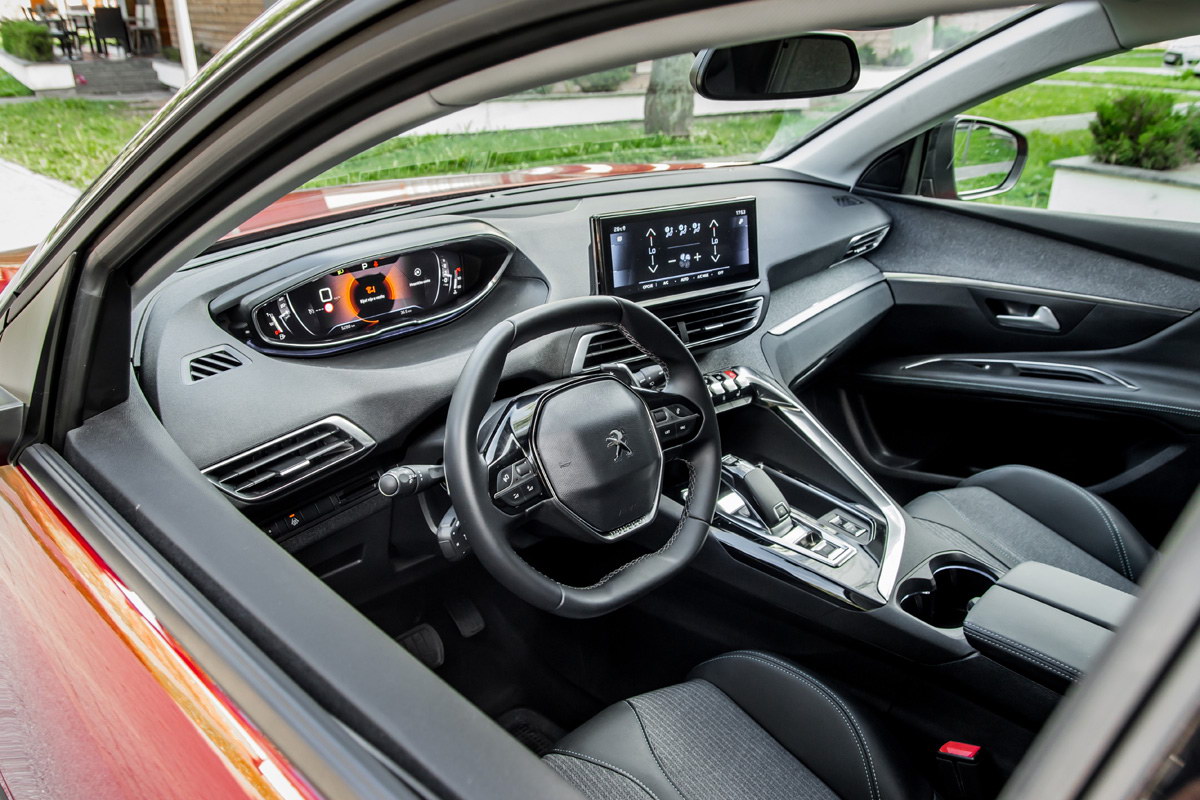 Lijepo profilisana sjedišta pružaju optimalnu kombinaciju udobnosti i čvrstoće koja je neophodna za dobro držanje tijela u dinamičnoj vožnji. Sama vozačka pozicija zahtjeva prilagođavanje i-Cockpitu, koji i dalje drži podijeljena mišljenja o svojoj funkcionalnosti – za i protiv. Podsjećanja radi, i-Cockpit konfigurisan je tako da je upravljač postavljen veoma nisko, faktički u krilu vozača, pa pogled vozača na instrumente ide preko upravljača. Zbog ove konfiguracije imate dodatni osjećaj povišene pozicije sjedenja, a neki vozači kada pronađu idealnu poziciju za vožnju neće imati najbolji pregled na instrument ploči.
