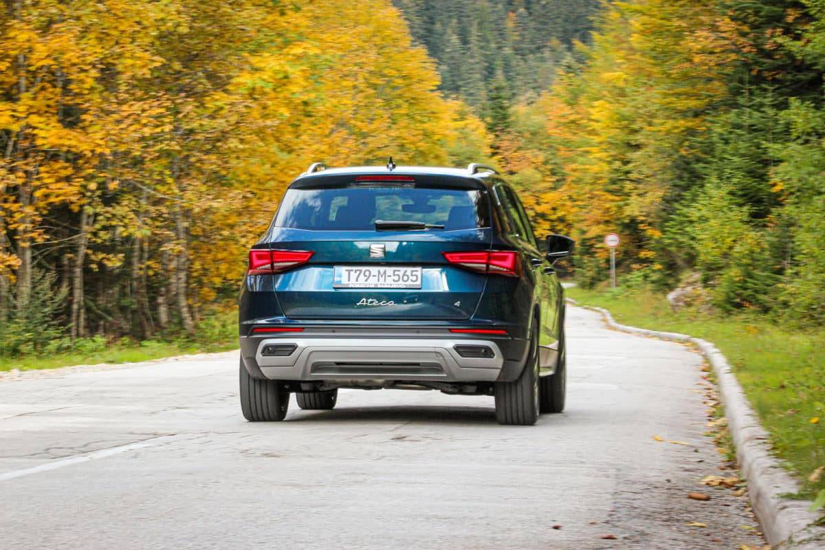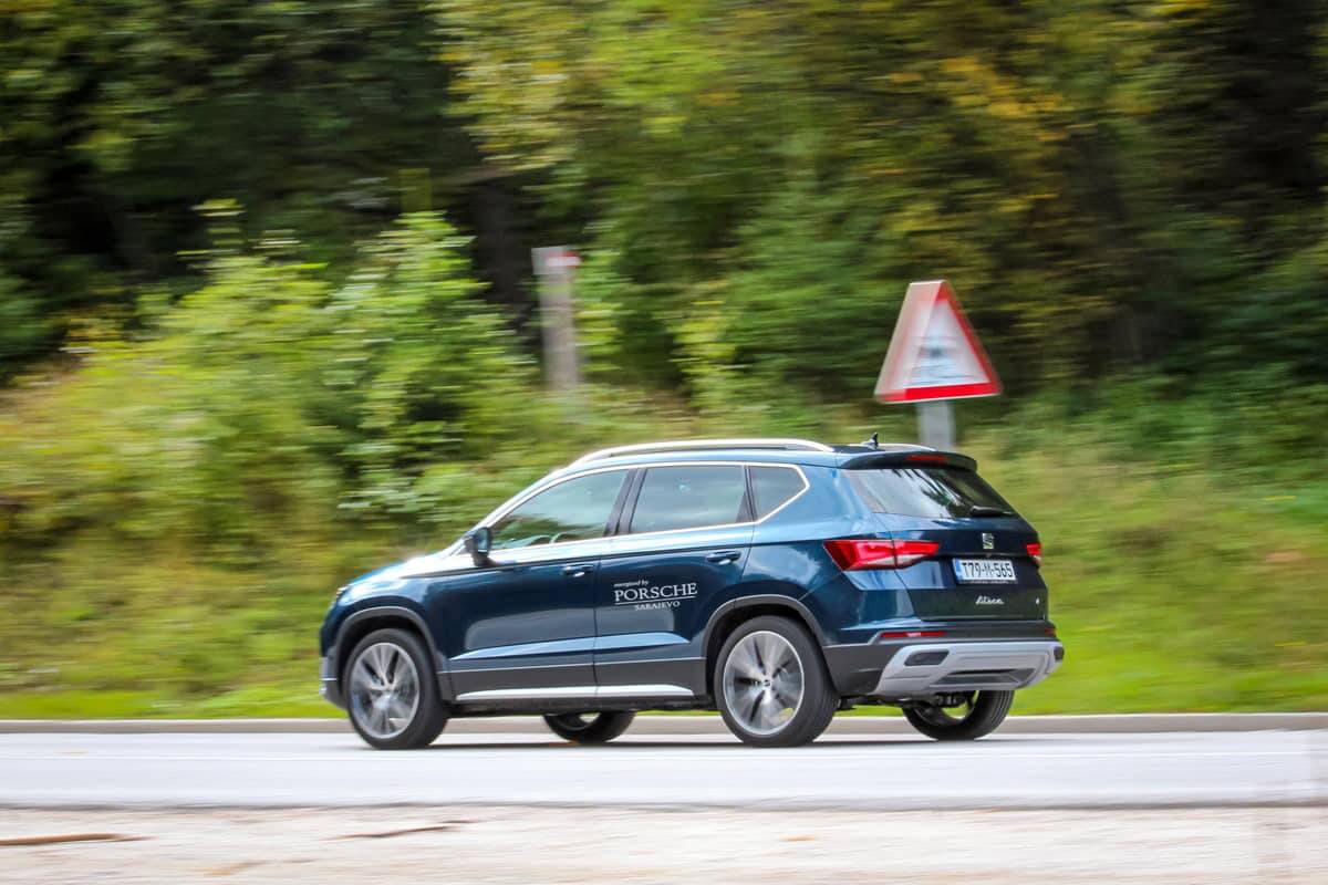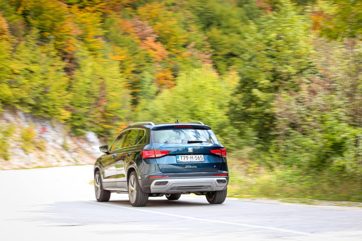 Ateca u ovoj kombinaciji motora, mjenjača i 4×4 sistema pogona na sve točkove ima ubrzanje 0 do 100 km/h za 8,8 sekundu i postiže maksimalnu brzinu od 200 km/h. To su svakako respektabilne performanse posebno kada u obzir uzmemo težinu od 1,8 tona. Bitan segment je i efikasnost pogonskog sklopa, a tokom testa u gradskim uslovima putni računar je zabilježio prosječnu potrošnju od 6,8 l/100 km (do 9 l/100 km u ekstremnim gužvama kada je bila pokrenuta i regeneracija DPF filtera).