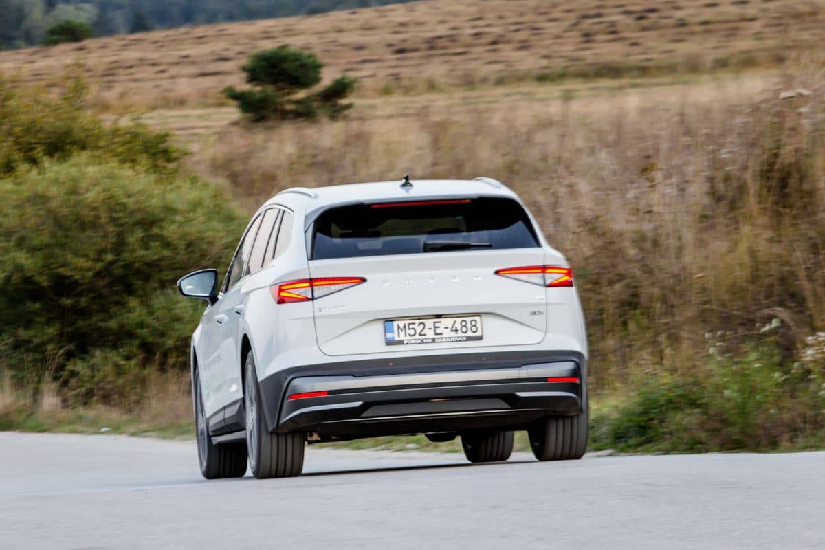 Snažni elektromotori koji se okreću i do 16.000 okretaja u minuti zaista fantastično guraju veliki češki SUV. Odziv na gas je momentalan pa u svakom momentu pogonski sklop spreman je da vas katapultira, bilo da krećete iz mjesta ili da ste se odlučili pretjecati. Ovaj električni automobil svoju dominaciju nad benzincima i dizelima najviše pokazuje na brzinama ispod 120 km/h. Iznad toga osjeti se nešto sporije ubrzanje, no svakako ovaj automobil i nije namijenjen za utrkivanje. Sa raspoloživom maksimalnom brzinom nećete nigdje zaostajati na autoputevima…