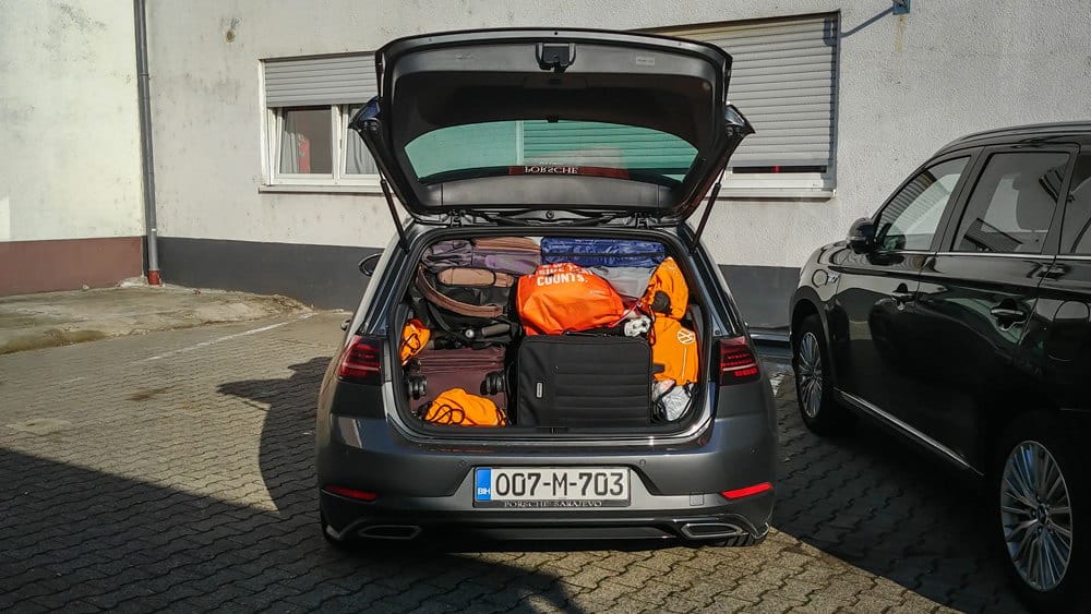 Same pripreme na odlazak na sedmodnevno putovanje zahtijevalo je dobru organizaciju i iskorištavanje svakog dijela prtljažnog prostora te svih raspoloživih pretinaca. Obično u testovima ti pretinci se usput spominju, a na ovakvim putovanjima mnogo znače. Zapremina prtljažnog prostora mjeri se u litrama, a rasporedom stvari u male torbe mi smo iskoristili i posljednji centilitar. Upravo male torbe ključne su za najbolje iskorištavanje prtljažnog prostora. Kada smo uspjeli složiti kompletan prtljag u kojem se našao i električni romobil, bili smo i više nego pozitivno iznenađeni, pa s pravom pitamo ko kaže da je Golf mali auto?