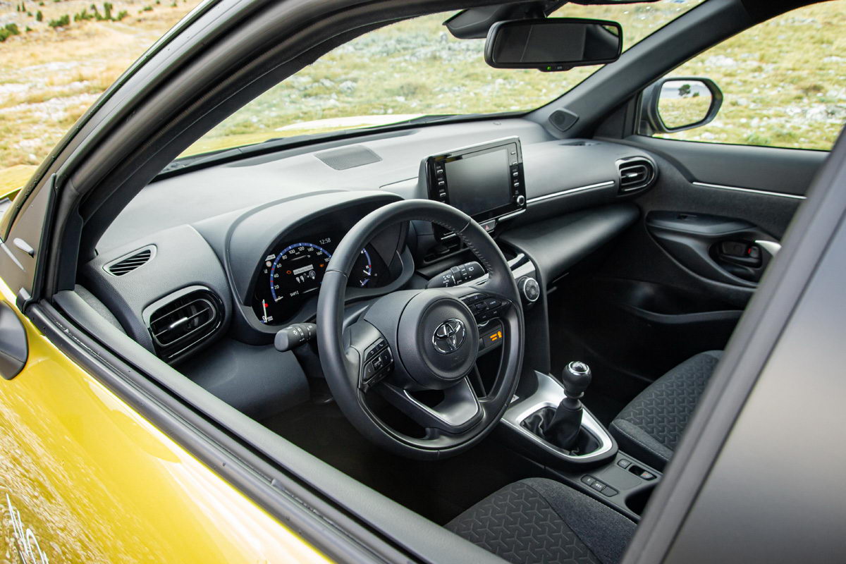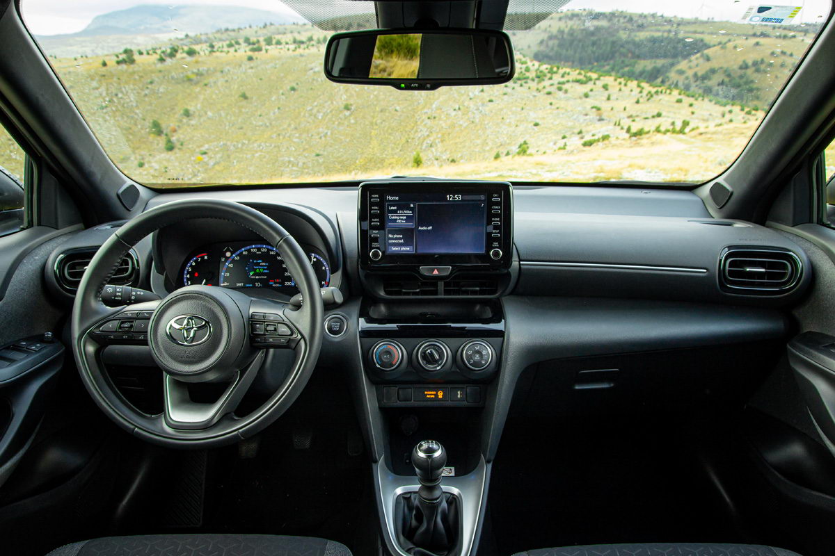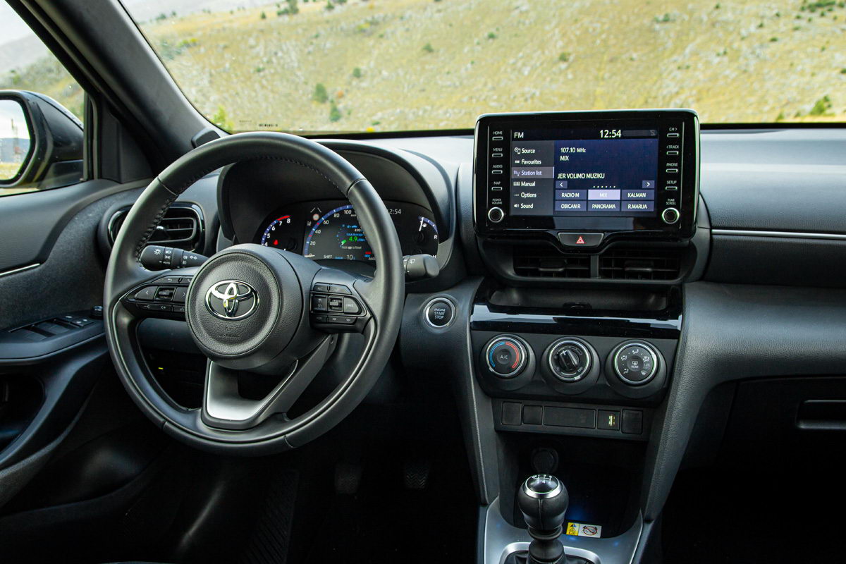 Unutrašnjost putničke kabine dizajnerski je ista kao kod klasičnog Yaris modela. Već pri prvom ulasku jasno vam je da sjedite u automobilu s povišenim položajem za vožnju kako i priliči pravom crossoveru. Ispred vozača je lijepo oblikovani multifunkcionalni trokraki upravljač koji lijepo leži u rukama, a njegov položaj može se jako dobro podesiti, posebno po dubini, što nije bi slučaj kod nekih prethodnih Toyota modela.