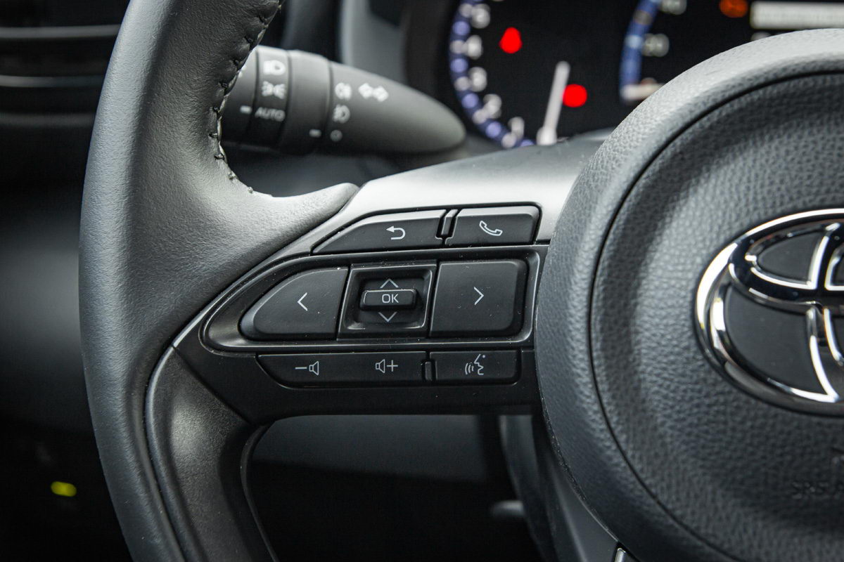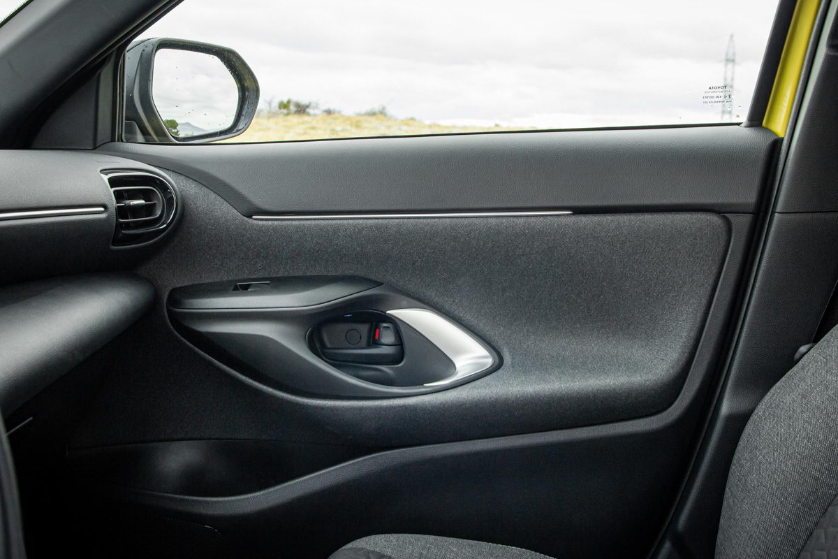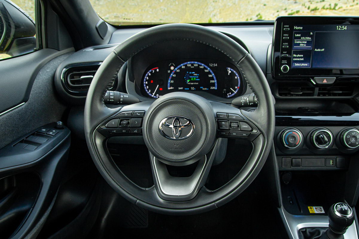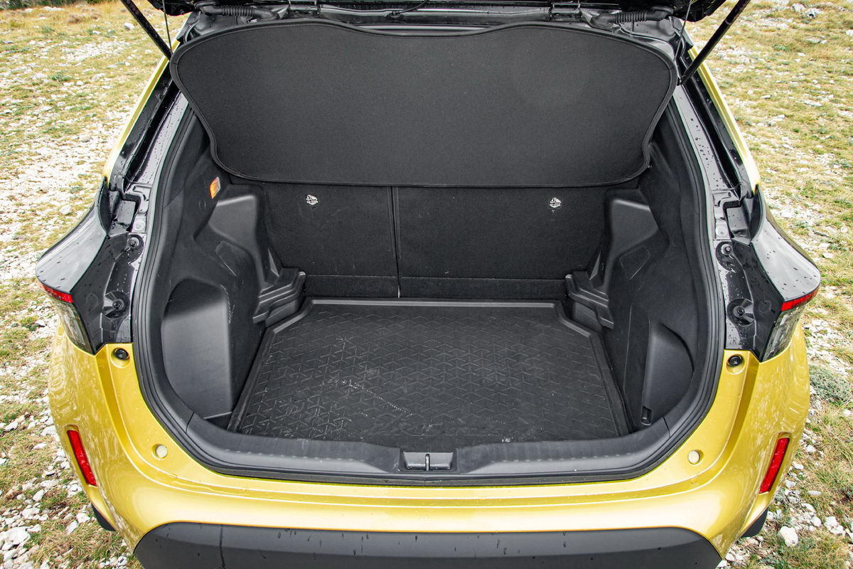 Unutrašnjost putničke kabine dizajnerski je ista kao kod klasičnog Yaris modela. Već pri prvom ulasku jasno vam je da sjedite u automobilu s povišenim položajem za vožnju kako i priliči pravom crossoveru. Ispred vozača je lijepo oblikovani multifunkcionalni trokraki upravljač koji lijepo leži u rukama, a njegov položaj može se jako dobro podesiti, posebno po dubini, što nije bi slučaj kod nekih prethodnih Toyota modela.