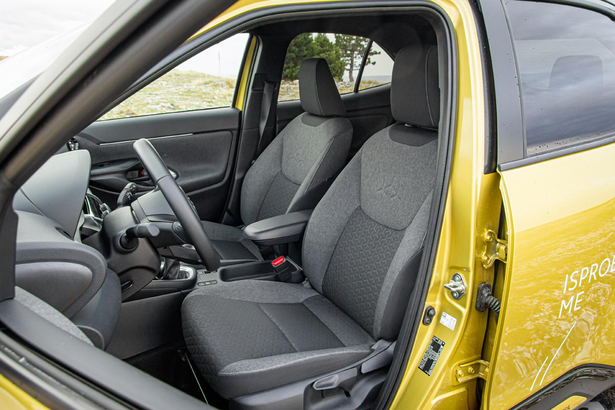 Prednja sjedišta u testnom modelu s Sport BiTone paketom opreme nude mogućnost višesmjernog podešavanja, dimenzije su solidne, ali definitivno da su inžinjeri mogli napraviti bolju profilisanost uz veći stepen udobnosti. Na prednjim sjedištima ima dovoljno prostora za odrasle putnike, međutim Yaris Cross se ne može pohvaliti s raskošnim prostorom za noge putnika na zadnjoj klupi.