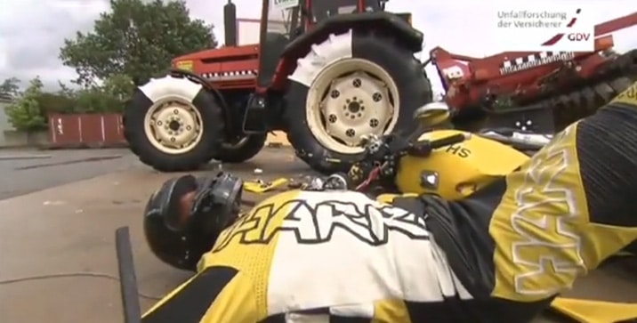 Njemački istražitelj nesreća napravio je realan test nesreće u kojem su učestvovali motocikl i traktor. Test je, očekivano, pokazao da motociklista nema šanse za preživljavanje, dok je vozač traktora ostao bez i jedne povrede.