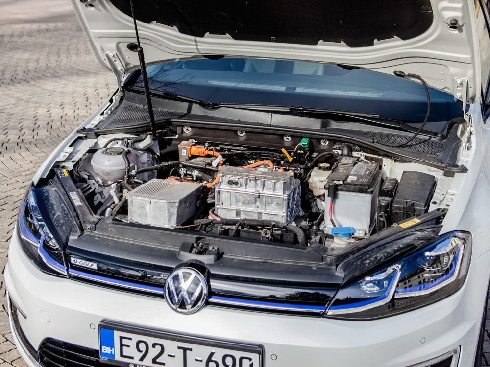 Električni motor i mjenjački sklop e-Golfa smješteni su naprijed, kao i kod klasičnog Golf modela. Otvaranjem poklopca motora vidjet ćete potpuno drugačije sklopove i dosta kablova, ali primijetit ćete da ovaj pogonski sklop zauzima manje prostora od klasičnog motora.