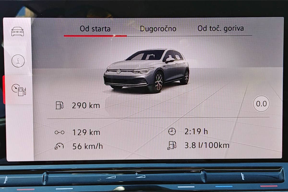 Na otvorenim putevima potrošnja je bila još niža, pa je novi Golf tokom testa na auto putu pri brzini do 130 km/h trošio 5,0 l/100 km. Na magistralnoj cesti, gdje smo se uglavnom pridržavali aktuelnih ograničenja brzine, putni računar je zabilježio veoma nisku potrošnju od svega 3,8 l/100 km.