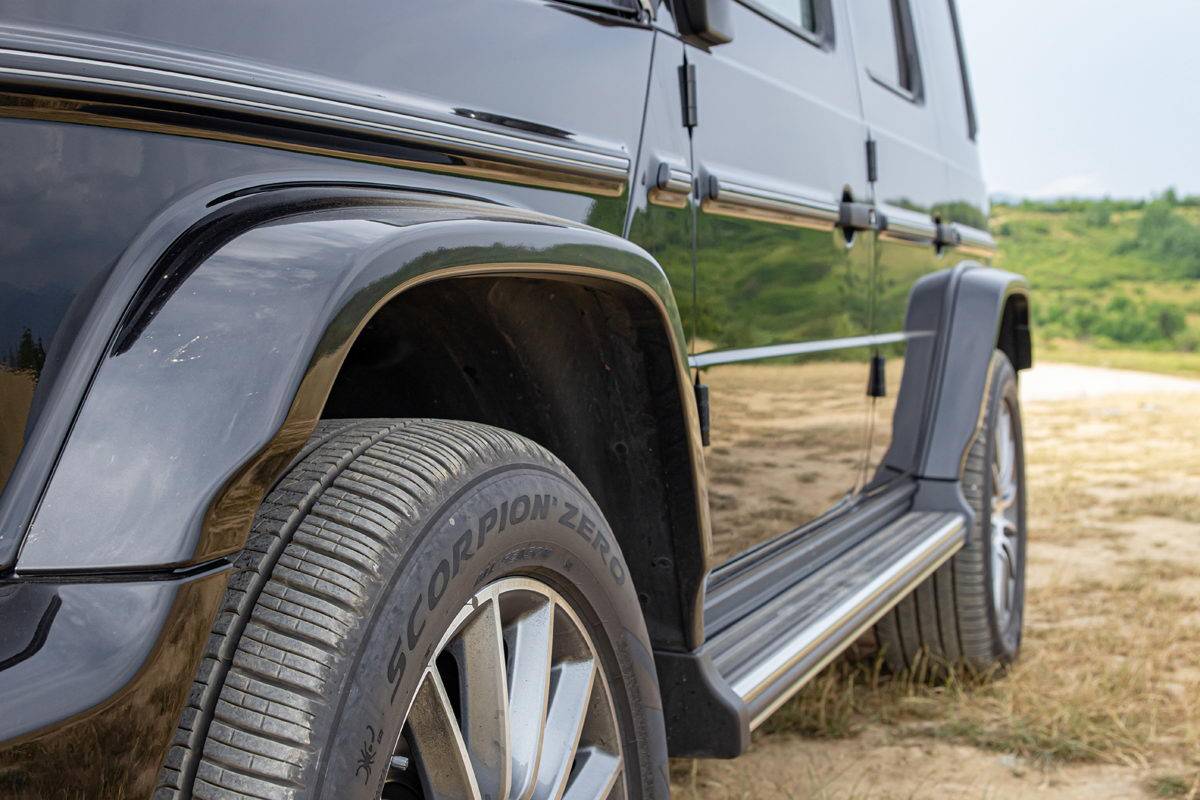 Još kratko ćemo se zadržati kod vanjskog dizajna koji je zaslužan da djelomično prikriva impozantne dimenzije automobila. Gledajući izdaleka “kutijasti G” ne izgleda tako veliko, međutim kada mu se približite shvatite da se radi o grdosiji čije su dimenzije u odnosu na prethodnika značajno veće. Dužina automobila je 4.817 mm, širina 1.931 (+120 mm), visina čak 1.969 mm, dok je međuosovinski razmak 2.890 mm. Najniža tačka karoserije je na zadnjem centralnom diferencijalu na visini od 241 mm, što znači da ova grdosija u rukama vještog vozača može savladati mnoge izazove.