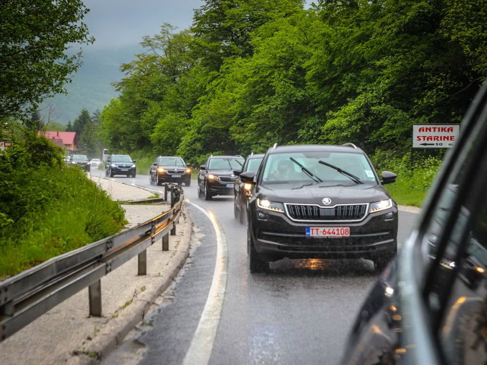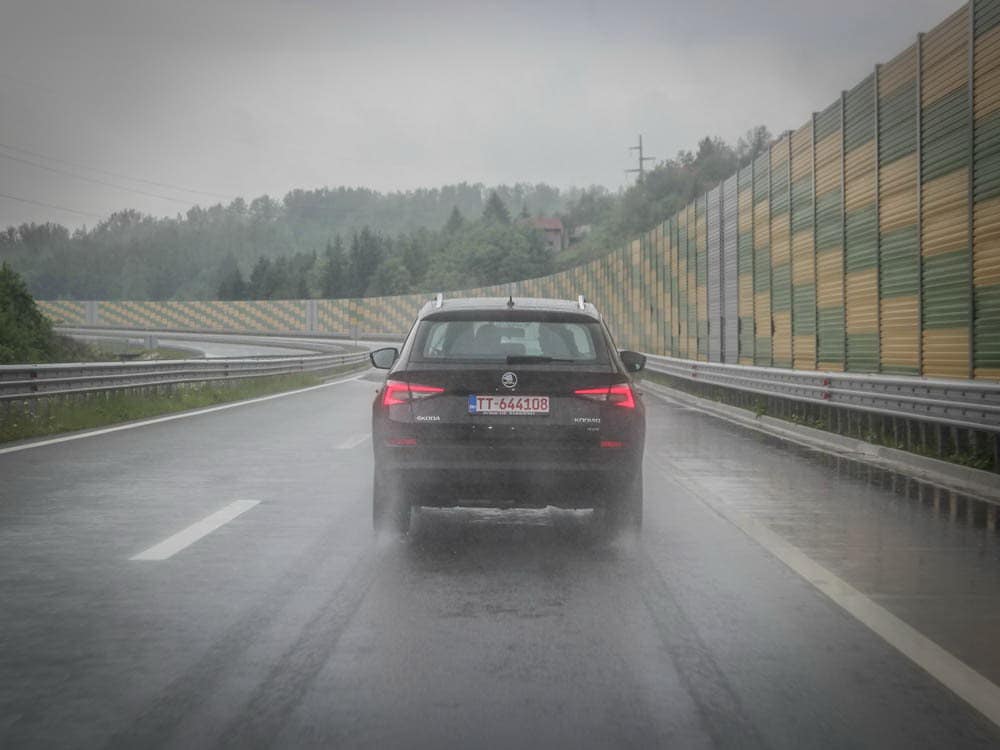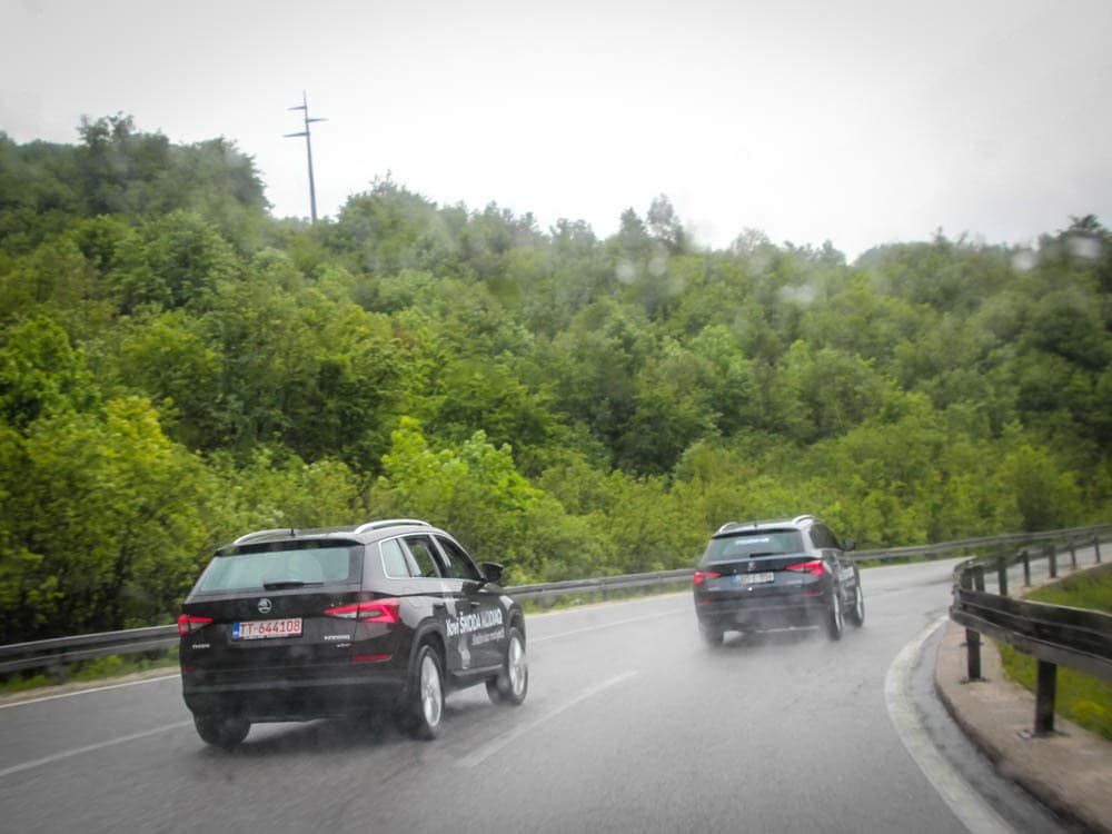 Kišno vrijeme koje nas je pratilo tokom cijele vožnje omogućilo je da se još bolje upoznamo sa svim mogućnostima Kodiaqa. Tako izlazak na auto put po kišnom vremenu pokazao je da Kodiaq ima zaista dobru zvučnu izolaciju putničke kabine jer je buka na vrlo niskom nivou, a upravljivost na odličnom nivou.