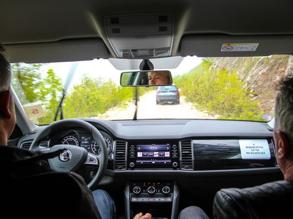 Silaskom sa auto puta i magistralne ceste na uređeni makadamski put na kojem je bilo dosta rupa punih vode sticali smo prva “Off Road” iskustva na kojim je Kodiaq opravdao očekivanja. Upijanje udarnih rupa, bez naginjanja karoserije ili nepoželjnih skakutanja dokaz su odlično urađenog posla kada je u pitanju ovjes. Jednostavno, Kodiaq se odlično ponaša i na auto putu gdje pri većim brzinama nema naganjanja karoserije, što je sklonost velikih SUV vozila, te na makadamu gdje je na “svom terenu”. Kratko rečeno za ovjes, pun pogodak!