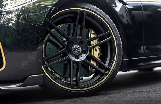 Postavljen je i novi ispušni sistem, a modifikovan je i ovjes koji je sada niži za 20 mm. Automobil je postavljen na Manhart 21 inčne aluminijumske felge u Silk-Matte Black boji sa zlatnim rubom. Ispod velikih točkova vide se kočiona kliješta koja su također obojena u zlatnu boju.
