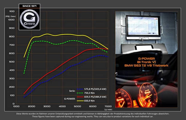 G-POWER je pripremio kompletan tunerski paket za najveći BMW-ov SUV, što ga čini šampionom u klasi i čime se potrvđuje 30 godina iskustva. Naime, korištenjem modula Bi-Tronik 5 V1, koji se postavlja između već postojećeg ECU-a i potentnog V8 motora, postiže se 650 KS i 830 Nm okretnog momenta. Preciznije 659,5 KS i 830,9 Nm, kako je izmjereno preciznim instrumentima.