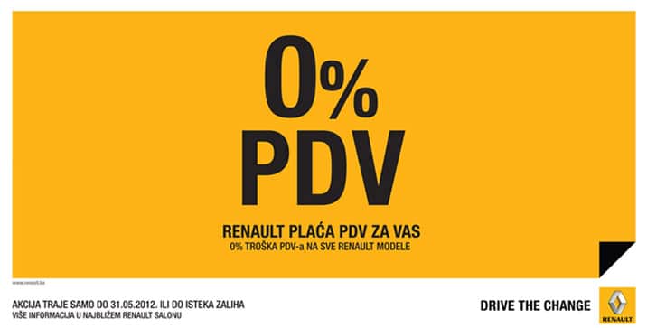 Renault je za svoje kupce u Bosni i Hercegovini ponovo pripremio, sada već tradicionalnu, prodajnu akciju pod nazivom “Renault plaća PDV za Vas” u kojoj na sve svoje modele nudi atraktivan i nadasve primamljiv popust u iznosu PDV stope, odnosno cijelih 17%.