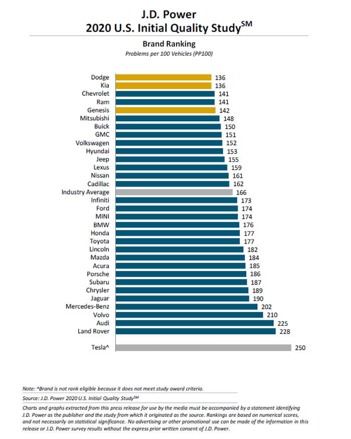 Kia se po nedavno objavljenim rezultatima studije J.D. Power 2020 o početnom zadovoljstvu vlasnika vozila u SAD (Initial Quality Study – IQS) zajedno s brendom Dodge plasirala na 1. mjesto i imala je prijavljenih 136 problema na 100 vozila. Kia je tako već 6 godina zaredom broj 1 kod masovnih proizvođača automobila. “To je izuzetna serija,” rekao je Dave Sargent, podpredsjednik kompanije J. D. Power, koji je odgovoran za kvalitet automobila.