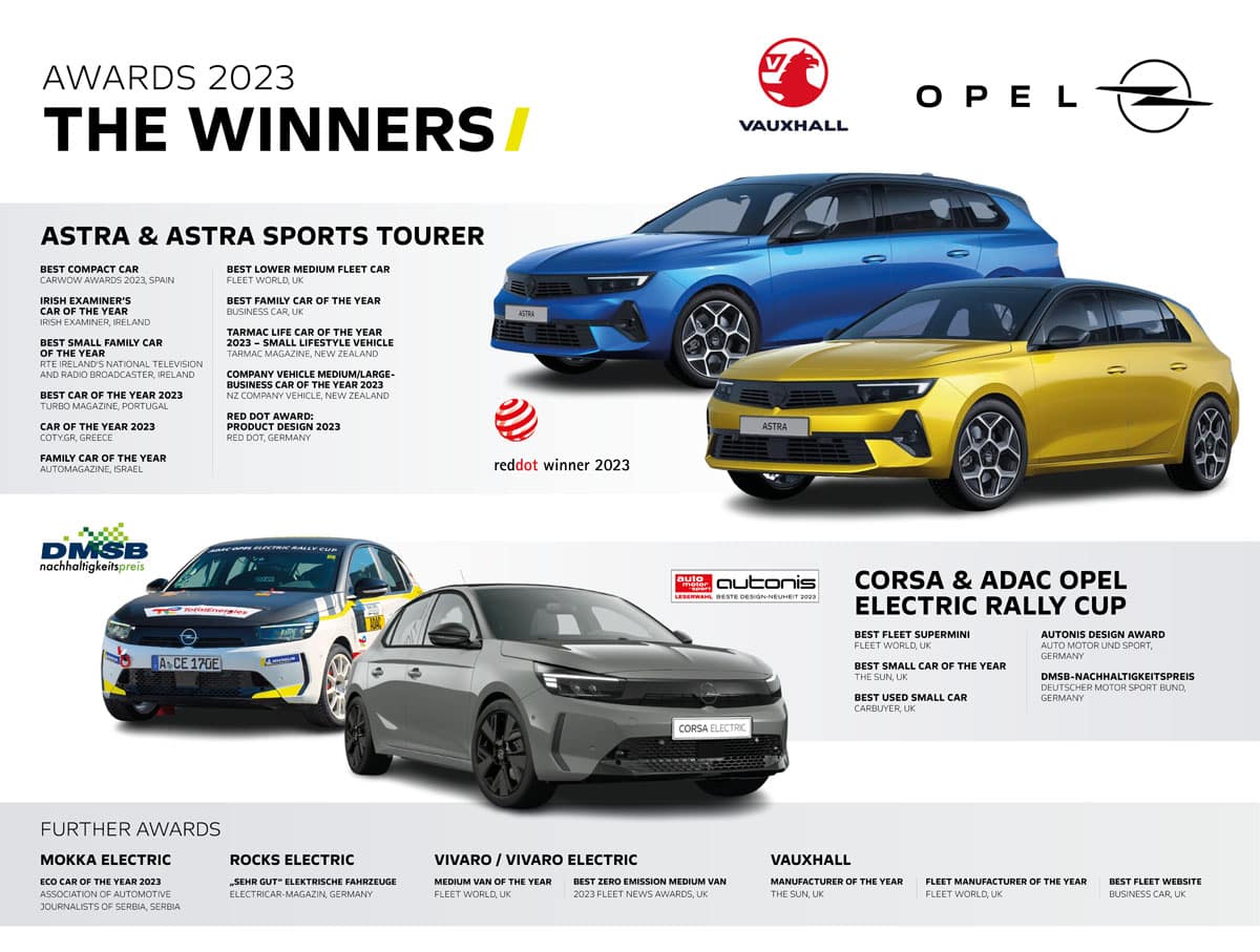 Automobili i furgoni nisu jedini privukli pažnju vozača i stručnjaka; brandovi Opel i Vauxhall sami su po sebi bili dovoljni da stvore osjećaj uzbuđenja: Opel je dobio nagradu za održivost „DMSB Sustainability Award” za svoj pionirski koncept automobila bez emisija Corsa Rally Electric. Vauxhall je pak proglašen „proizvođačem godine” u Ujedinjenom Kraljevstvu. Nova generacija Opel Astre proglašena je „najboljim automobilom godine” u brojnim zemljama i kategorijama širom svijeta, isto kao i novi model Opel Corse. Rocks Electric, Mokka Electric i svestrano lagano gospodarsko vozilo Vivaro također su se pridružili dobitnicima nagrada 2023.