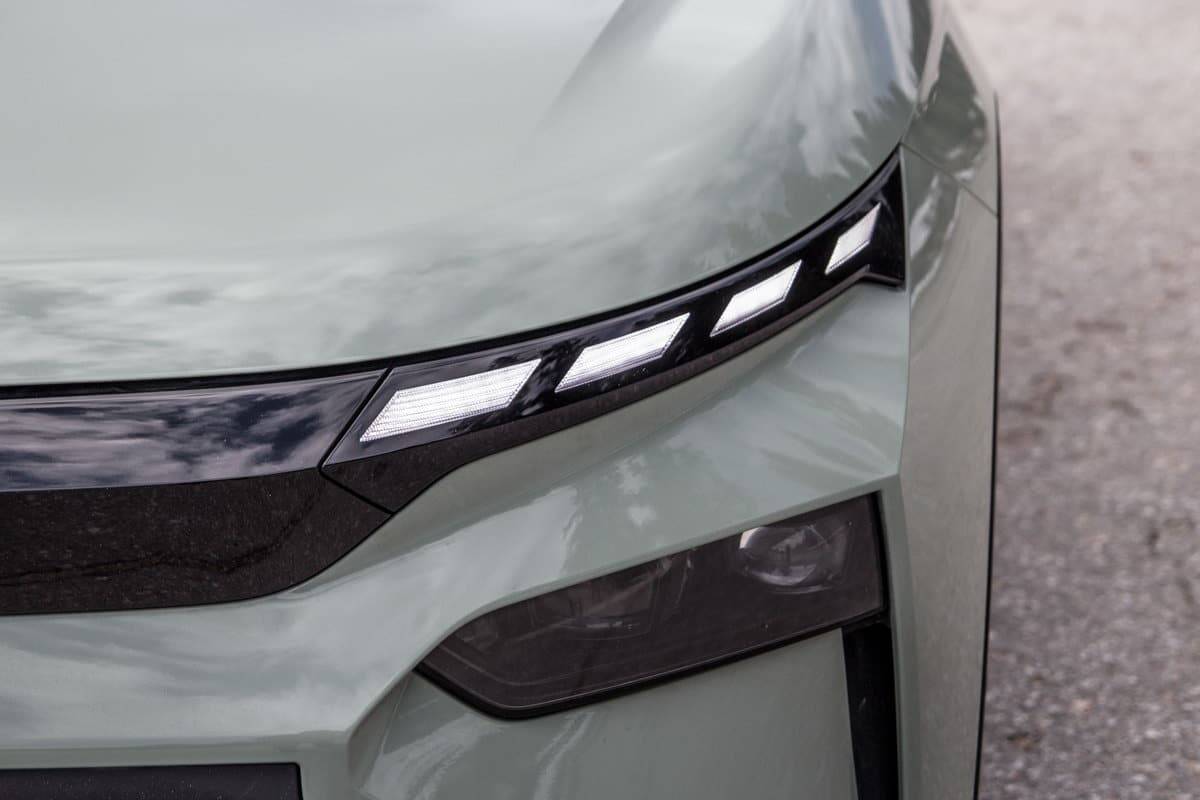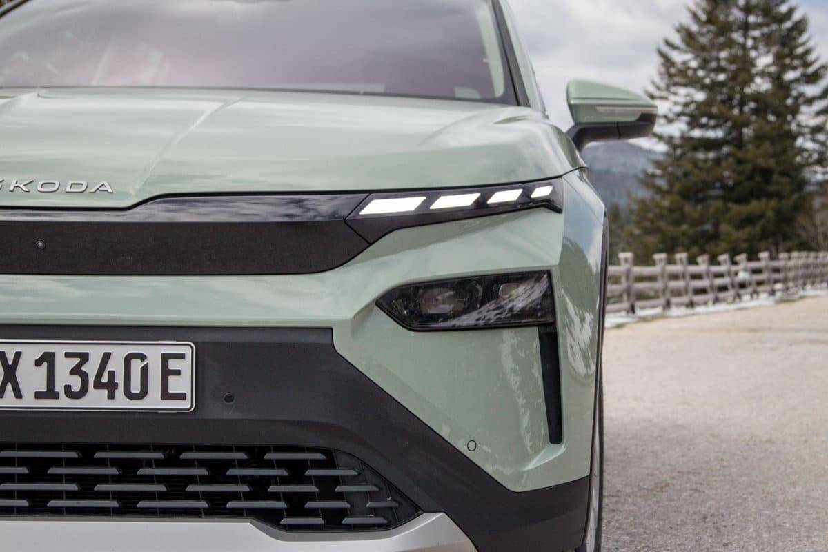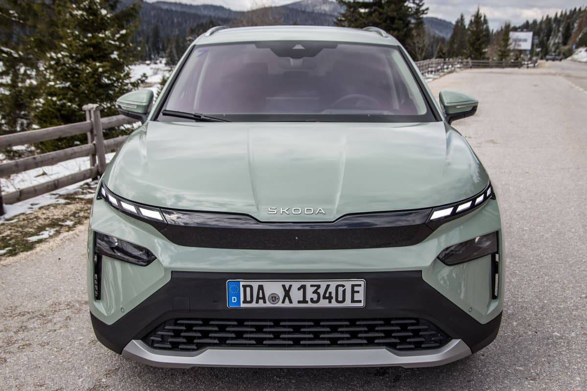 Novi Škoda Elroq donosi svjež, robustan izgled u duhu novog dizajnerskog jezika marke pod nazivom “Modern Solid”, koji označava ulazak Škode u novu eru električne mobilnosti. Prednji dio vozila karakteriše zatvorena maska, tipična za EV modele, ali s oštrijim, modernim linijama koje sugerišu dinamičnost i sofisticiranost. LED Matrix prednja svjetla su tankog, horizontalnog oblika, povezana svjetlosnom trakom koja dodatno naglašava širinu vozila i futuristički izgled.