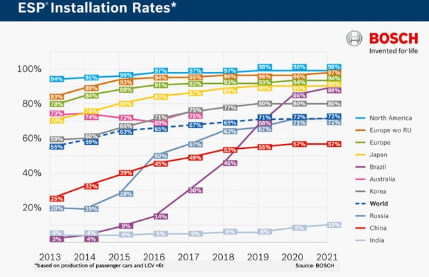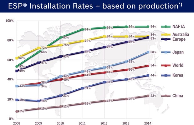 Prema prognozama kompanije Bosch, do 2020. godine, preko 90 % svih proizvedenih vozila u Sjevernoj Americi, Evropi i Japanu će imati serijski ugrađen ESP.