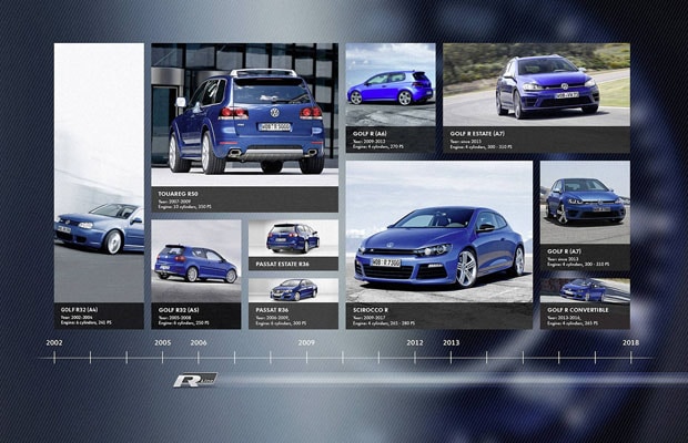 Proizvodnja R modela započela je 2002. godine modelom Golf R32. Od tada uslijedila su još 3 Golf R modela te Passat R36, Touareg R50, Scirocco R, Golf R cabrio i Golf R u karavanskoj izvedbi. Danas je Golf R dostupan kao hatchback i karavan. Obje izvedbe opremljene su dvolitarskim benzinskim motorom s turbopunjenjem i 4MOTION pogonom na sve točkove.