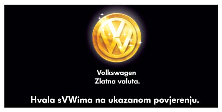 Volkswagen BiH je pokrenuo tradicionalnu imidž kampanju nazvanu “Volkswagen Zlatna valuta”. Volkswagen je, zaista, već odavno zlatna valuta na automobilskom tržištu, jer svako Volkswagen vozilo, od segmenta malih pa do luksuznih i SUV vozila, nosi u sebi karakteristike koje čine genetski kod Volkswagen marke: kvalitet izrade, efikasnost kroz nisku potrošnju i nisku emisiju štetnih plinova, ekonomičnost kroz niske troškove održavanja vozila i odlično očuvanje stabilne cijene dugi niz godina, a koje je posebno bitan faktor za bh. podneblje.