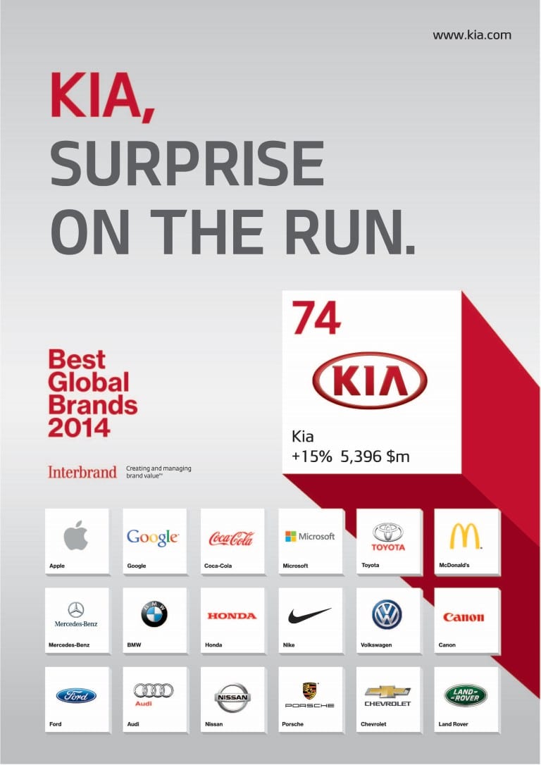Kia se tek 2012. godine prvi put našla na Interbrandovom popisu 100 „Najboljih svjetskih brandova“, zauzevši 87. mjesto. Prvobitnu vrijednost od 4,1 milijarde američkih dolara, 2013. povećala je na 4,7 milijardi, popevši se na 83. poziciju. Tokom prošle godine Kijina vrijednost povećala se za dodatnih 15 posto, što je korejskog proizvođača automobila smjestilo na 74. poziciju s vrijednošću u iznosu 5,4 milijardi američkih dolara. Prema ovogodišnjem istraživanju, prosječna stopa rasta vrijednosti brandova iznosila je 7%, što je više nego dvostruko manje od rasta kojeg je zabilježila Kia.